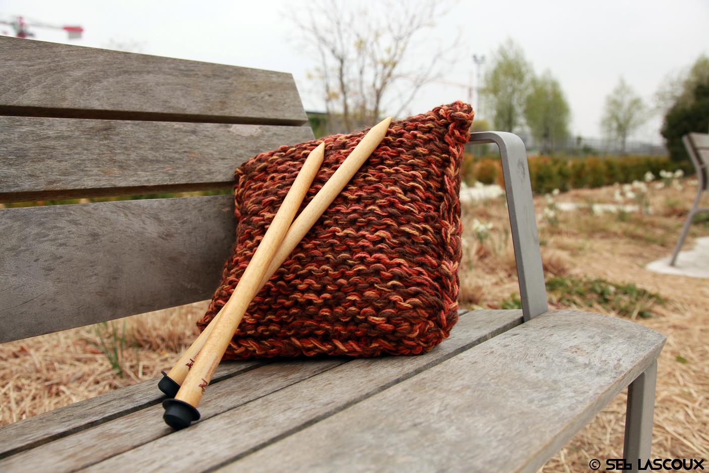 Et voici mon projet Déco, le coussin de l’extrême. Pour l’occasion, je me suis dit que c’était l’occasion de tester mon kit « Extrême Knitting » acheté sur le site Tricotin.  Qu’est-ce que l' »Extrême knitting »? C’est grâce à Elise que j’ai découvert cette technique, (elle en parle ici) et j’ai tout de suite voulu la tester !!