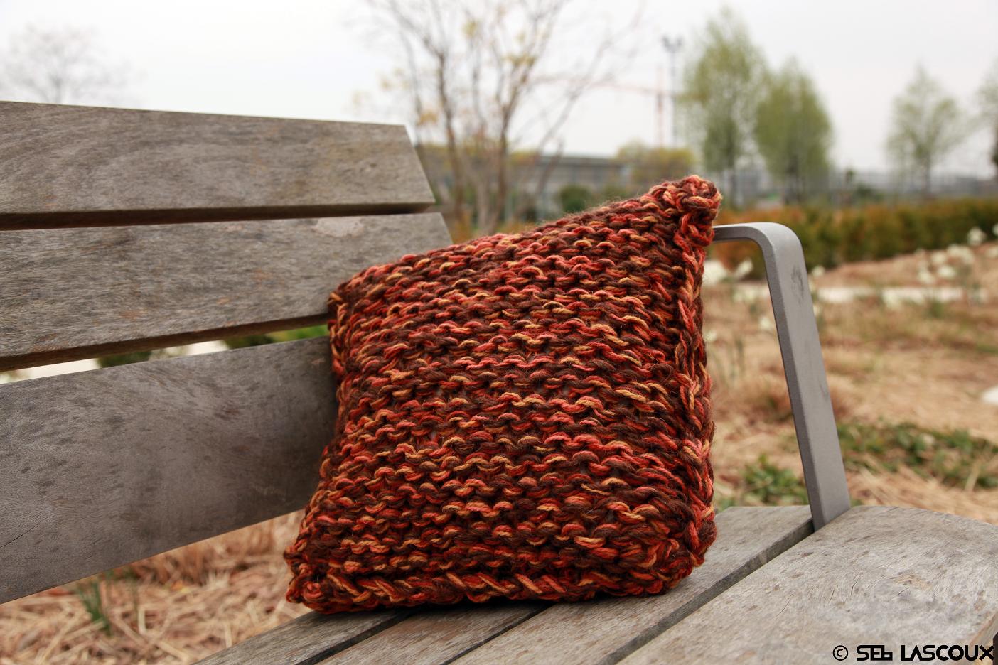 Les instructions du kit étaient mal traduites, néanmoins la promesse est la réalisation d’un coussin en moins de 2 heures…j’ai mis 2h30! en revanche, le kit ne prévoyait pas suffisamment de laine: en effet, ce coussin est tricoté avec 5 pelotes différentes en laine acrylique (d’ailleurs pas du tout agréable au toucher, soyons clair, ce coussin ne me servira jamais pour une sieste!) dont une beaucoup plus épaisse que les autres mais avec un métrage plus court, résultat: sur la photo du dessous, on remarque que le haut du coussin est plus « clair « (c-à-d avec moins de marron) que les rangs du bas ou milieu…