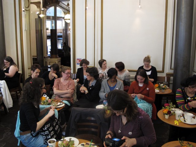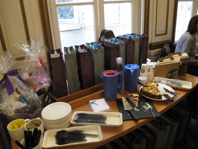 Nous avons été très bien accueilli par less organisatrices, Tima, Aline et Elisabeth, qui avaient organisé une petite collation, au menu: cheesecake (miam miam), tartes aux pommes, jus d’orange, café et thé, bref, tout ce qu’il faut pour motiver des tricoteuses de bon matin!!