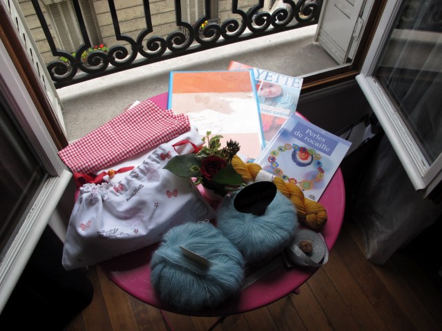 Et oui tout cela!! Des livres, de la laine: un superbe écheveau de Lorna’s lace offert par L’Oisivethé ainsi que 2 pelotes de mohair offertes par le Caf’e tricot studio (lieu que je ne connais pas encore, il me tarde d’aller y faire un petit tour!!), des tissus, des rubans, un cahier à patrons (qui va me servir à ranger mes patrons errants imprimés), une pochette avec des perles, des anneaux marqueurs fabriqués par Astrante, et une broche en forme de fleur crochetée, bref, ça fait plaisir de se lever le samedi matin et de revenir chargée comme cela!!!