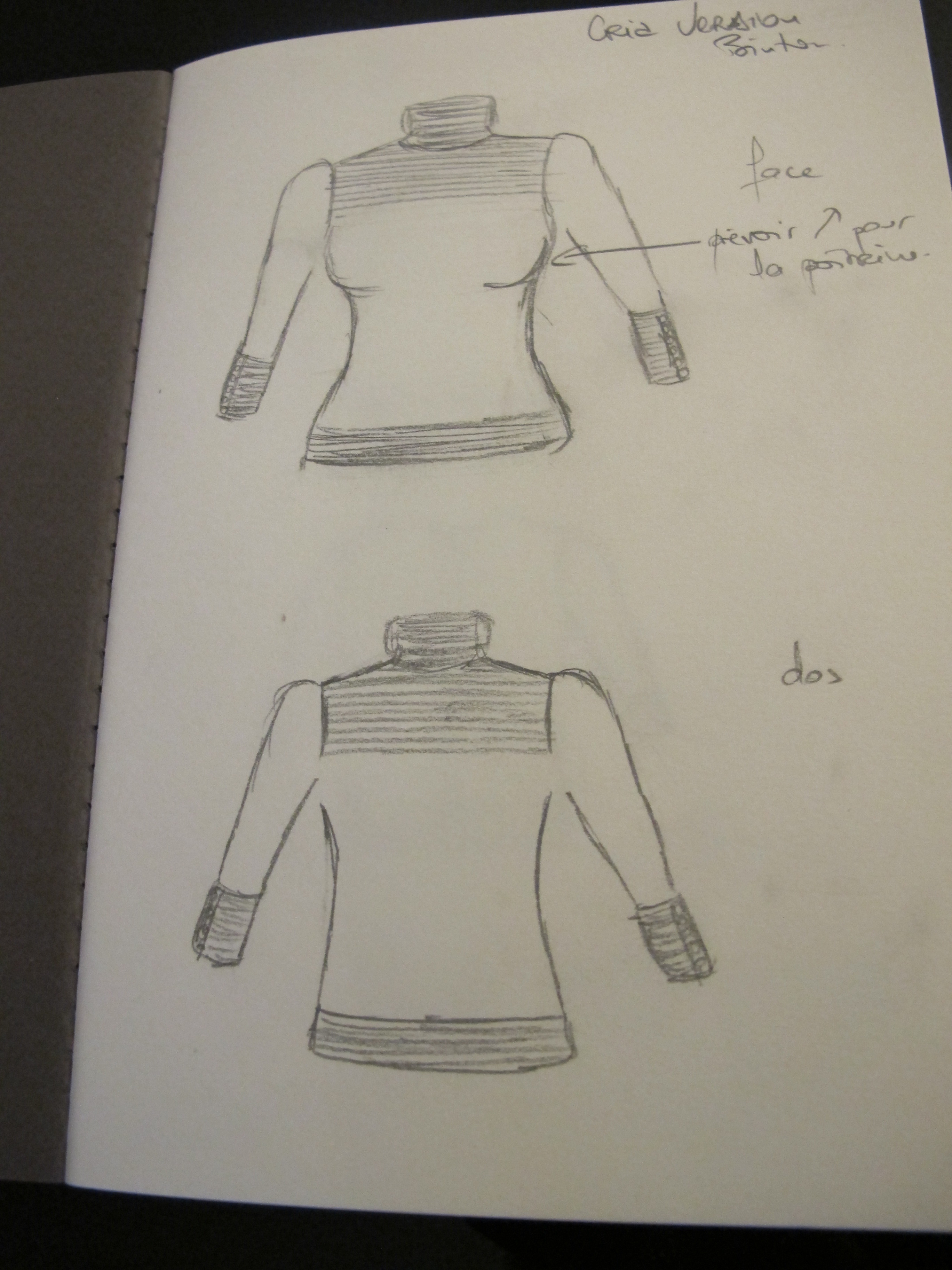 En gros, un petit pull droit à manches 3/4, je pense également à faire de petites ouvertures en bas de chaque côté.