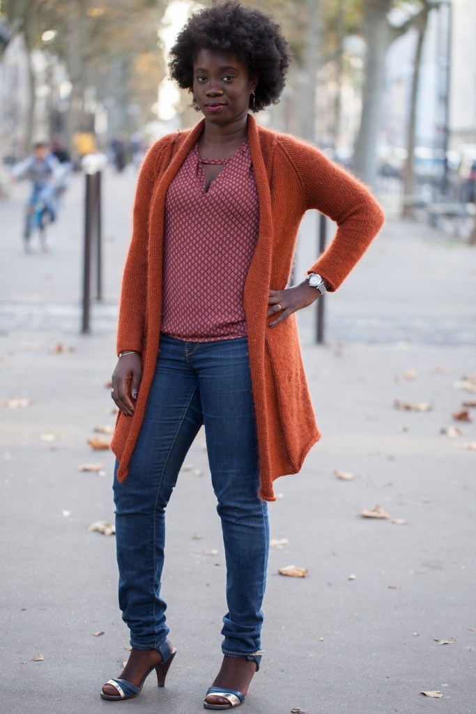 Un de mes gilets favoris : Arnett de Olgajazzy, un gilet dont je vous ai déjà parlé ici que j’affectionne particulièrement car il est tout doux et très chaud (grâce au mélange laine/soie/mohair ). J’ai choisi de le tricoter dans un vrai ton d’automne car ce brun/carotte est une couleur que j’affectionne particulièrement et que si marie très bien avec le prune, une autre de mes couleurs favorites. Je sais que c’est une couleur qui peut parfois dérouter, comme cela a été le cas pour Elise, dans ce cas, n’hésitez pas à opter pour une couleur plus neutre et moins vive (un gris ou un bleu marine par exemple) .