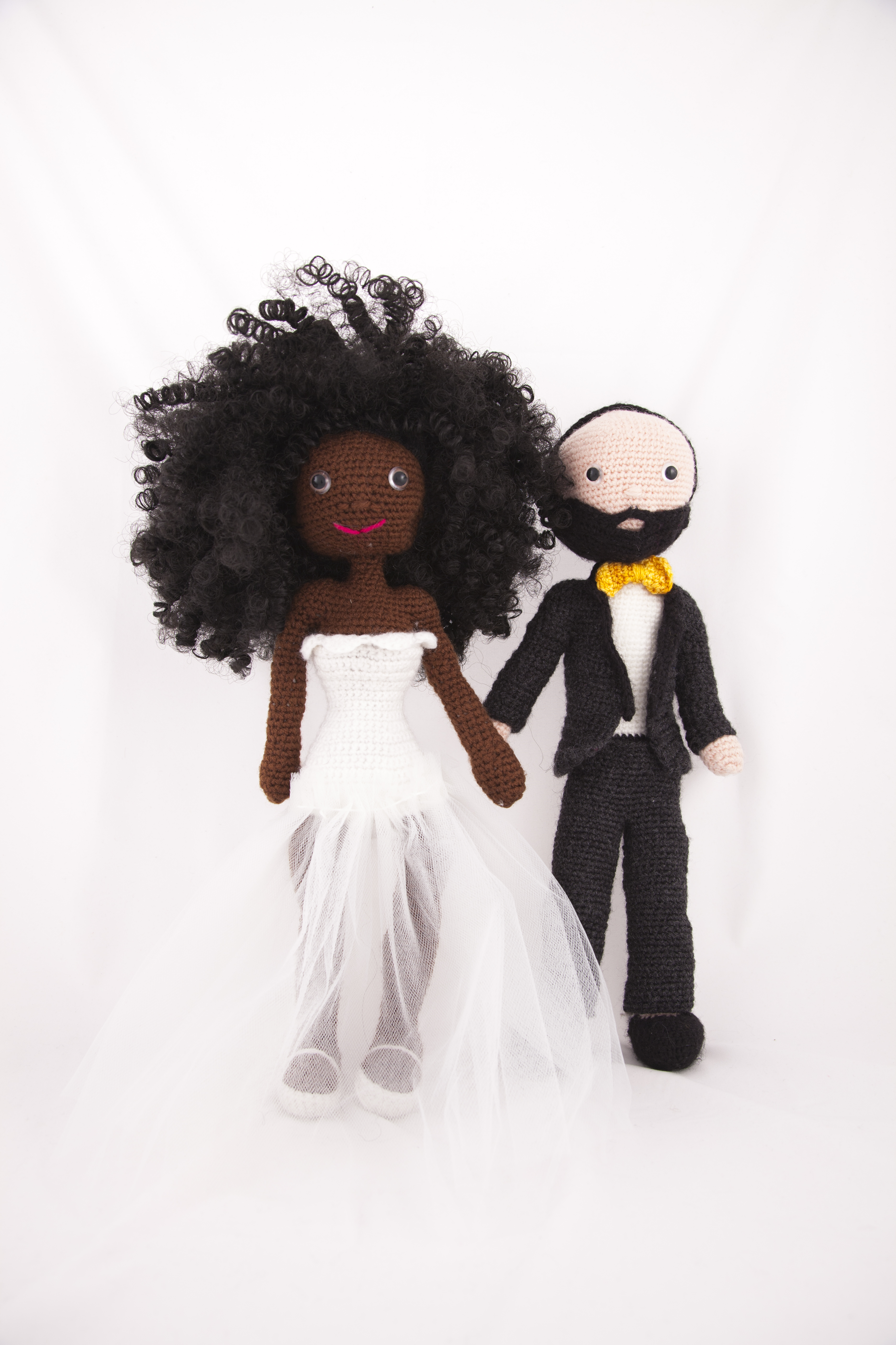 Comme on voulait quelque chose de très personnel,  j’ai pris mon crochet et j’ai crocheté 2 petites poupées à notre effigie ! J’ai trouvé ce patron sur Ravelry pour m’aider et que j’ai modifié selon mes envies. Je n’ai pas utilisé la laine préconisée par le patron, du coup mes figurines sont un peu plus grandes (environ 25 cm de hauteur). Mon chéri s’est chargé de la partie photo et texte, et hop c’était fait !