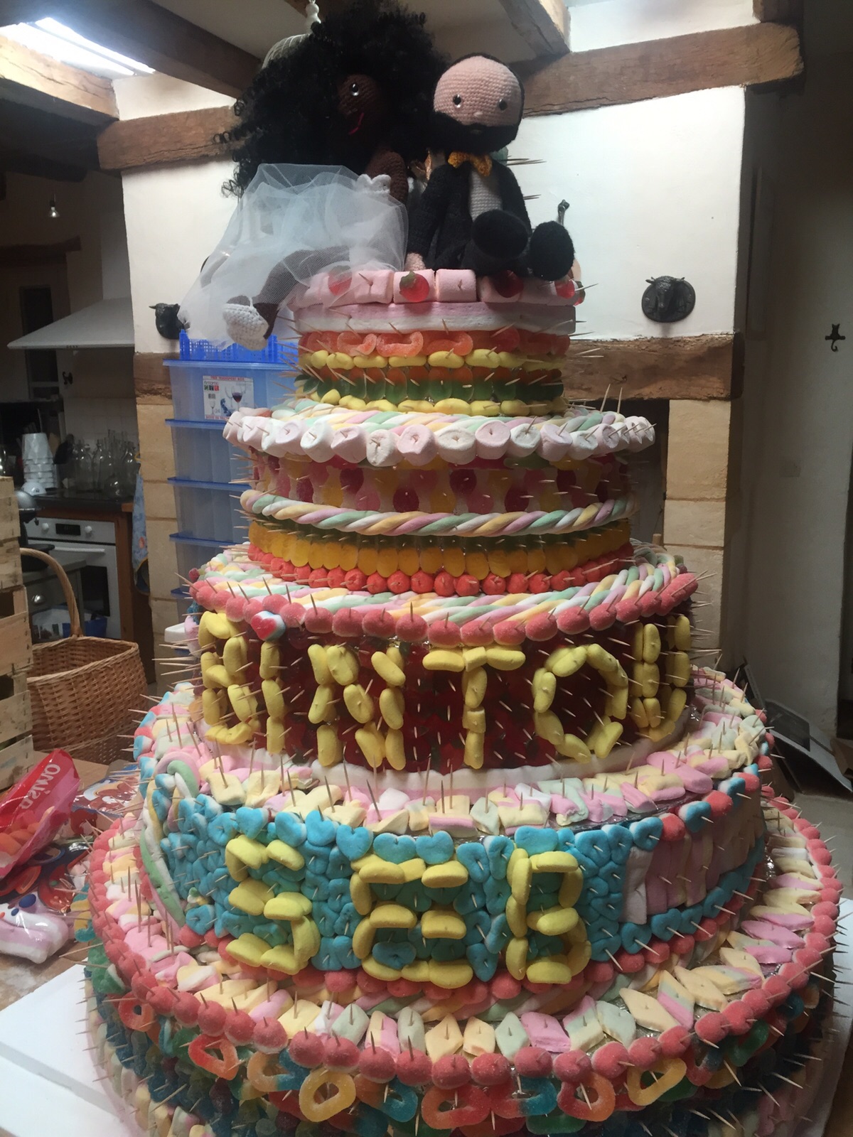 Notre solution: une pièce montée de bonbons réalisée par les demoiselles et garçons d’honneur en un temps record la veille du mariage !