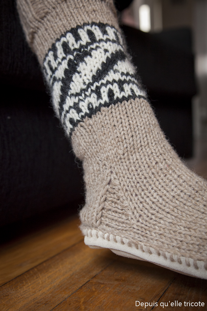 Ceux qui me suivent sur Instagram ont pu apercevoir le résultat de mes chaussons « Cowichan style » : un bon compromis pour m’entraîner au jacquard tout en faisant des chaussettes (et oui rappelez-vous, octobre le mois de la chaussette…:-))